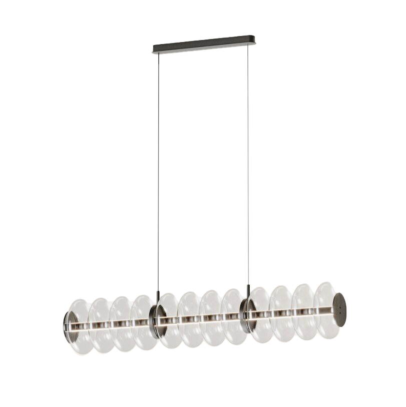 Aromas Del Campon Vitree L on näyttävä, pitkittäinen riippuvalaisin, jossa useat aaltoilevat lasiosat muodostavat rytmikkään kokonaisuuden. Tämä valaisin on täydellinen ruokapöydän, neuvottelutilan tai baaritason ylle. Saatavana kultaisilla tai mustilla metalliosilla, ja himmennettävä valo tekee siitä monikäyttöisen eri tiloihin.